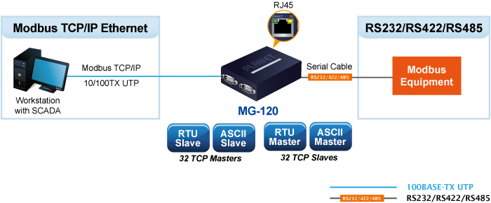 Planet MG-120 представляет собой двухпортовый преобразователь протоколов Modbus, предназначенный для интеграции последовательного оборудования в сети Ethernet. Устройство обеспечивает двустороннюю конвертацию данных между протоколами Modbus TCP, Modbus RTU и Modbus ASCII.