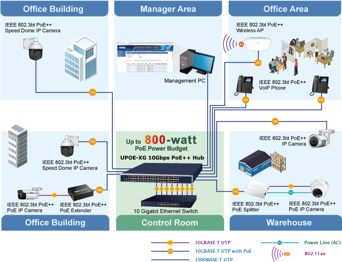 Благодаря высокой плотности портов и поддержке мультигигабитных скоростей, Planet UPOE-2400XG является оптимальным выбором для следующих сфер: