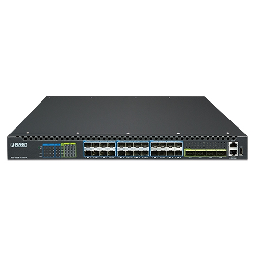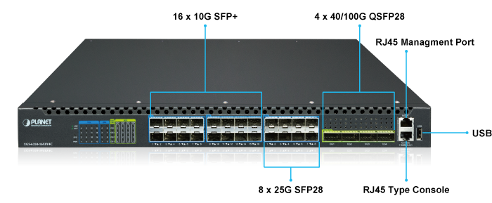 PLANET XGS-6350-16X8Y4C представляет собой высокопроизводительный управляемый коммутатор третьего уровня (Layer 3), разработанный для обеспечения высокоскоростной передачи данных в сетях следующего поколения. Модель выполнена в компактном форм-факторе 1RU и оснащена портами высокой плотности: 10G SFP+, 25G SFP28 и 100G QSFP28, что позволяет использовать её в качестве ядра сети или агрегатора трафика в современных ИТ-инфраструктурах.