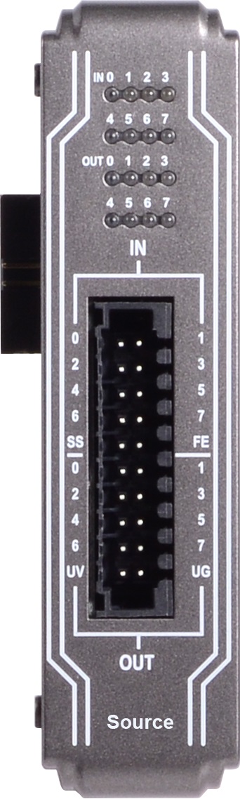 - Выходы: 8 каналов типа Source (PNP), с выходным напряжением 11–28 В постоянного тока и максимальным током нагрузки 0,5 А на канал (максимум 4 А). Время отклика: включение–выключение — 0,3 мс, выключение–включение — 0,3 мс; включение–выключение — 1 мс, выключение–включение — 5 мс.