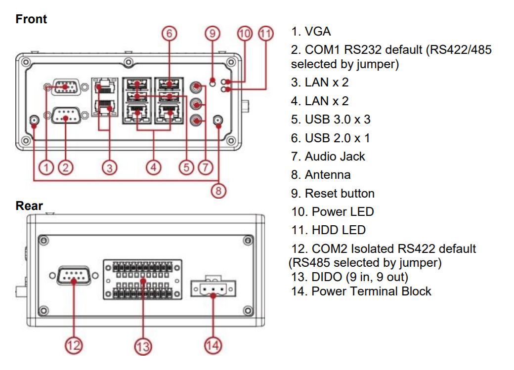 Устройство оснащено четырьмя гигабитными Ethernet-портами, одним VGA-видеовыходом, одним портом RS-232, одним RS-422, одним USB 2.0 и тремя USB 3.0. Также имеются цифровые входы/выходы (DIDO), аудиовыход и слот M.2 (KEY E) для опциональных модулей Wi-Fi и 4G. Питание осуществляется от источника постоянного тока с диапазоном входного напряжения от 9 до 36 В DC.