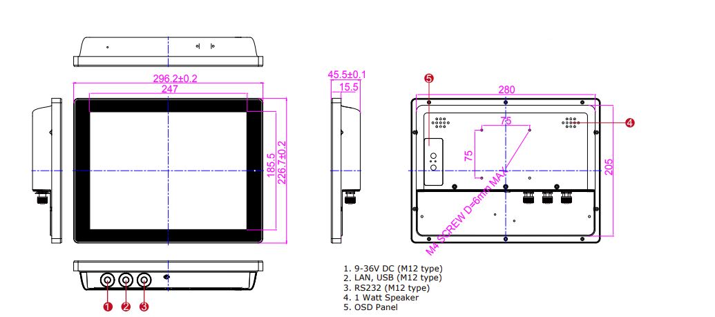 - Водонепроницаемые разъёмы M12 — обеспечивают защиту от влаги и пыли, соответствуют стандарту IP65.