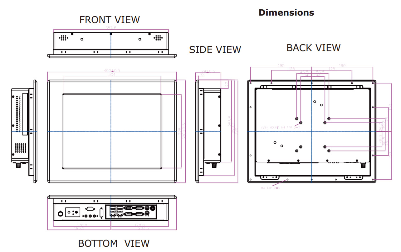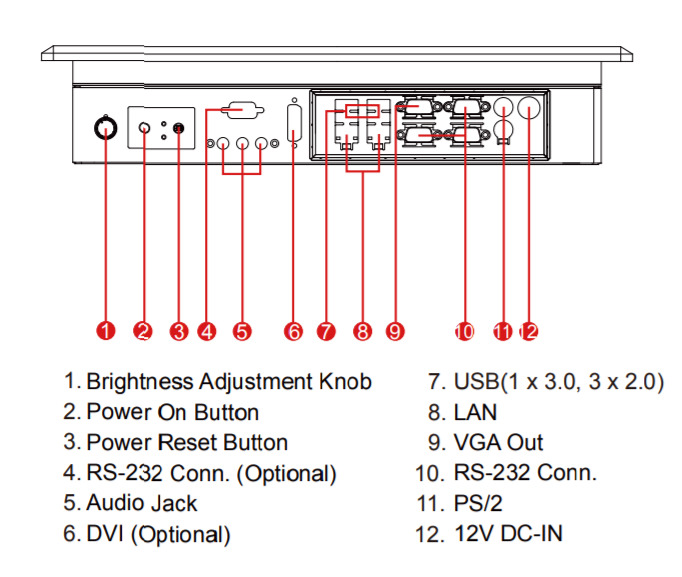 Устройство оснащено двумя портами Ethernet 10/100/1000 (RJ-45), одним VGA, 24-битным LVDS, опциональным DVI, тремя портами RS-232, одним USB 3.0, тремя USB 2.0, двумя слотами Mini PCIe (для Wi-Fi и 3G-модуля), одним eDP и двумя портами PS/2. Резистивный сенсорный экран обеспечивает точное управление, а класс защиты IP65 по передней панели гарантирует защиту от пыли и влаги.