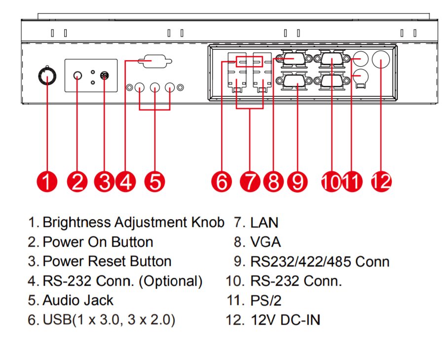 Сетевые возможности включают два порта Ethernet 10/100/1000 (RJ-45) с контроллером Intel I210-AT, обеспечивая стабильное подключение к промышленным сетям. Для подключения периферийных устройств предусмотрены два порта RS-232, один комбинированный порт RS-232/422/485, три порта USB 2.0 и один порт USB 3.0. Дополнительные возможности расширения включают два слота Mini PCIe для установки модулей Wi-Fi и 3G, а также два порта PS/2 для подключения клавиатуры и мыши. Аудиоинтерфейсы представлены разъёмами Line In, Line Out и Mic In (3,5 мм).