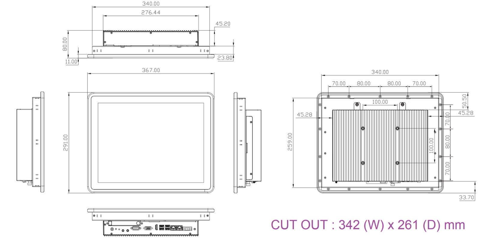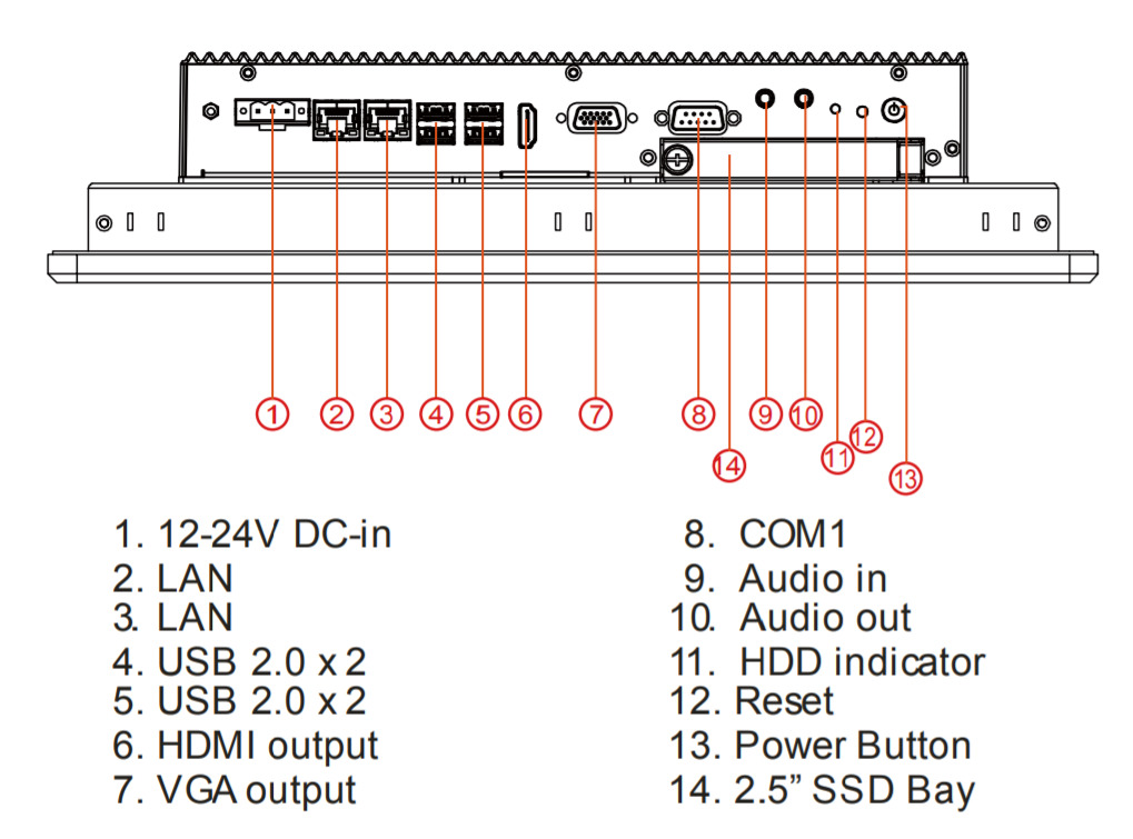 - Порты ввода/вывода: один порт RS-232/422/485, четыре порта USB 2.0, аудиовыход и аудиовход для подключения периферийных устройств.