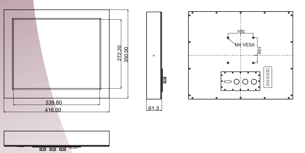 - Габаритные размеры: 416 x 350 x 61,3 мм, с возможностью настольного монтажа или крепления по стандарту VESA 100 x 100 мм.