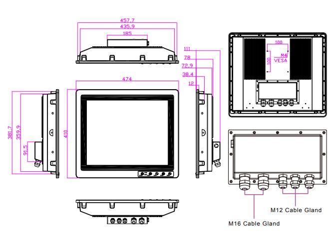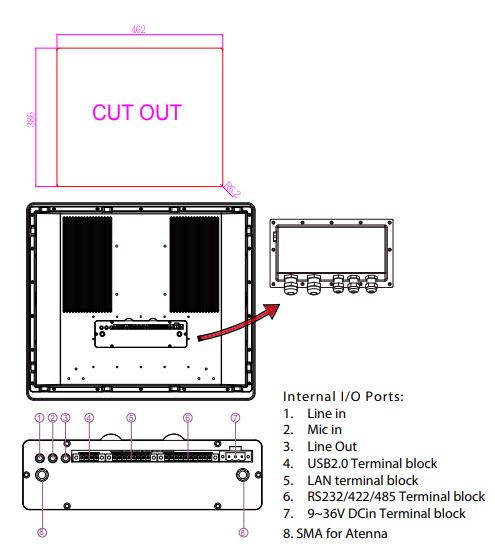Устройство оснащено стандартными интерфейсами: два порта USB 3.0, один порт USB 2.0, два порта RS-232, один порт RS-422/485, один порт VGA и один порт HDMI, что обеспечивает совместимость с различными периферийными устройствами. Для подключения к сети предусмотрены два порта Gigabit Ethernet (RJ-45). Панельный компьютер поддерживает питание от источника постоянного тока 12 В, что упрощает интеграцию в существующие системы.