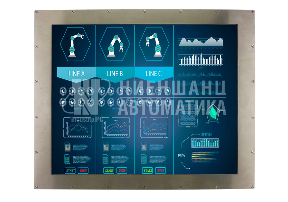 Монитор оснащен резистивным сенсорным экраном, устойчивым к воздействию влаги, пыли и механических повреждений. В качестве опции доступно защитное стекло, которое дополнительно защищает экран от царапин и других повреждений, сохраняя его функциональность даже при наличии дефектов на поверхности.