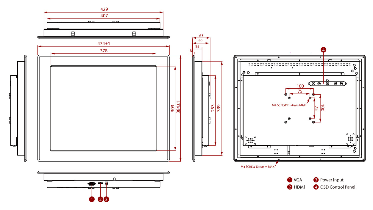 Монитор оснащен резистивным сенсорным экраном с интерфейсом RS-232, что позволяет интегрировать его в системы автоматизации и управления. Входы VGA и HDMI обеспечивают совместимость с различными источниками видеосигнала. Опциональный вход DVI расширяет возможности подключения. Корпус выполнен из алюминия с защитой по передней панели класса IP65, что гарантирует защиту от пыли и влаги, а также устойчивость к механическим повреждениям.
