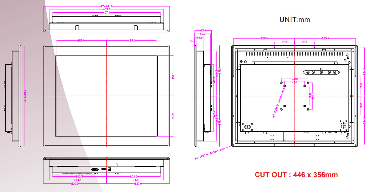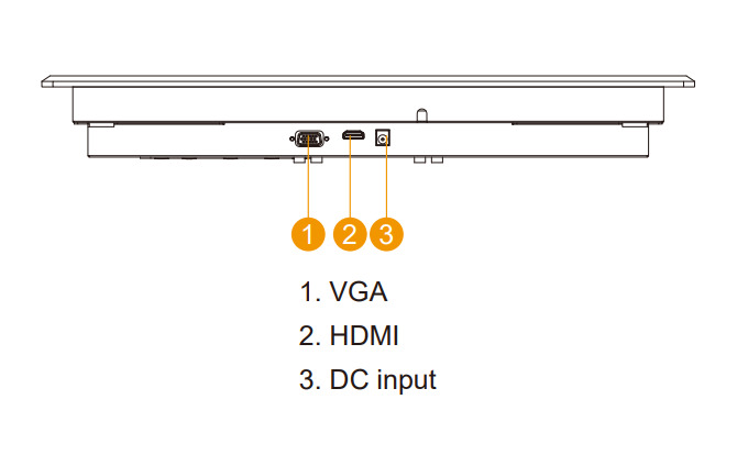 Монитор оснащен двумя видеоинтерфейсами: VGA и HDMI, что обеспечивает гибкость при подключении к различным устройствам. Для монтажа предусмотрены крепления VESA 100x100 мм и возможность встраивания в панель, что упрощает интеграцию в существующие системы.
