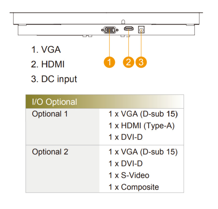 Монитор поддерживает два видеоинтерфейса: VGA (D-sub 15) и HDMI (Type-A), что обеспечивает гибкость при подключении к различным устройствам. Питание осуществляется от внешнего адаптера с входным напряжением 12 В DC, что упрощает интеграцию в существующие системы.