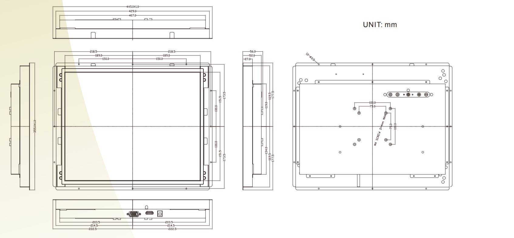 Габаритные размеры устройства составляют 445 x 355 x 56 мм, с возможностью монтажа через VESA крепление (100 x 100 мм) или в панель, что обеспечивает удобство установки в ограниченных пространствах. Угол обзора достигает 170° по горизонтали и 160° по вертикали, обеспечивая комфортный просмотр изображения с различных позиций.
