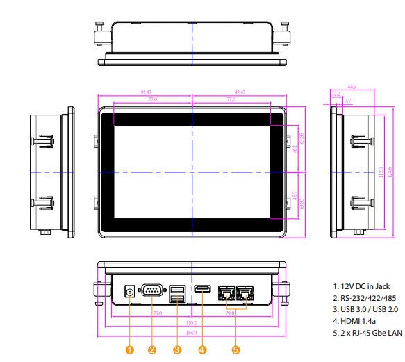 Панельный компьютер Winmate W07IB3S-EHT1 оснащён 7-дюймовым проекционно-ёмкостным сенсорным экраном с разрешением 1024 x 600 пикселей, обеспечивая чёткое отображение информации. В основе устройства лежит процессор Intel Celeron N2930 с тактовой частотой 1,83 ГГц, поддерживающий до 8 ГБ оперативной памяти DDR3L через разъём SO-DIMM. Встроенный SSD-накопитель объёмом 64 ГБ формата mSATA гарантирует быструю загрузку и надёжное хранение данных. Для подключения периферийных устройств предусмотрены два порта USB, два порта Gigabit Ethernet (RJ45), один последовательный порт (RS-232) и один HDMI. Питание осуществляется от источника постоянного тока 12 В DC, что делает устройство совместимым с различными промышленными источниками питания.
