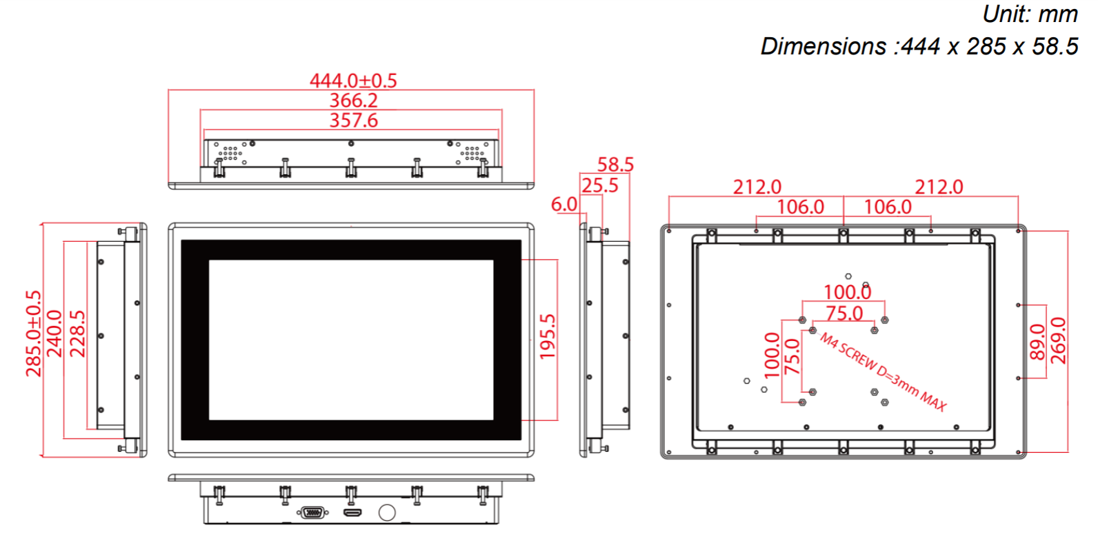 - Габаритные размеры: 444 х 285 х 58,5 мм, с возможностью монтажа в панель и креплением VESA 75 x 75 мм.