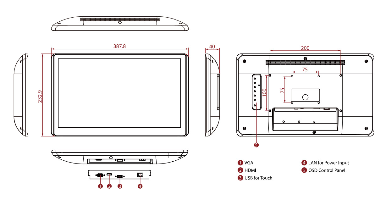 Дисплей оснащен проекционно-емкостным сенсорным экраном, поддерживающим мультитач, что обеспечивает высокую чувствительность и точность ввода. Передняя панель имеет степень защиты IP65, гарантируя защиту от пыли и влаги. Возможности подключения включают VGA и HDMI порты, а также опциональный DVI, что обеспечивает гибкость при интеграции с различным оборудованием. Встроенные динамики и опциональный пульт дистанционного управления расширяют функциональность устройства. Монитор поддерживает питание от 12 В DC, что упрощает его подключение в промышленных условиях.