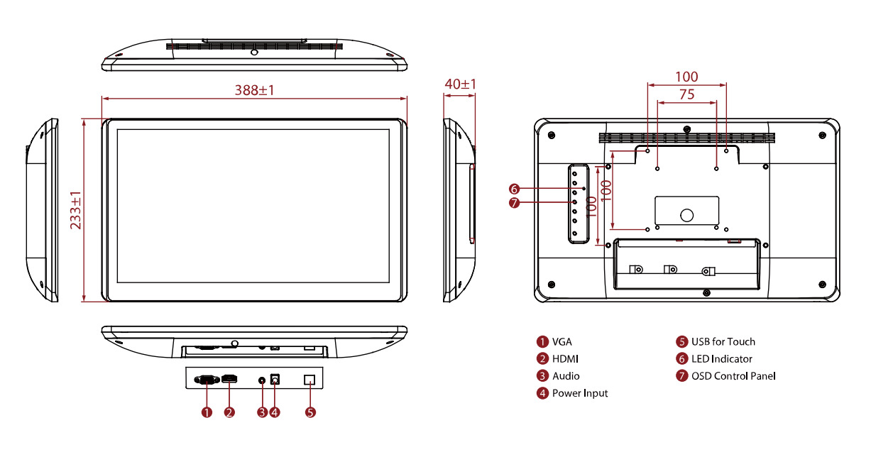 Разрешение Full HD (1920 x 1080) и яркость панели 400 нит обеспечивают четкое изображение при различных уровнях освещенности. Проекционно-емкостной сенсорный экран поддерживает многоточечное касание, что повышает точность ввода данных. Входы VGA и HDMI позволяют подключать различные медицинские устройства и системы. Корпус с антибактериальным покрытием и степень защиты IP65 по передней панели способствуют поддержанию гигиеничности и долговечности устройства. Пассивная система охлаждения исключает использование вентиляторов, минимизируя риск распространения микробов и пыли. Монитор работает от источника питания 12 В DC, что упрощает интеграцию в существующие системы. Размеры устройства составляют 388 x 233 x 40 мм, что позволяет устанавливать его в ограниченных пространствах. Сертификации IEC 60601-1, IEC 60601-1-2 и IEC 60601-1-6 подтверждают соответствие международным стандартам безопасности и электромагнитной совместимости.