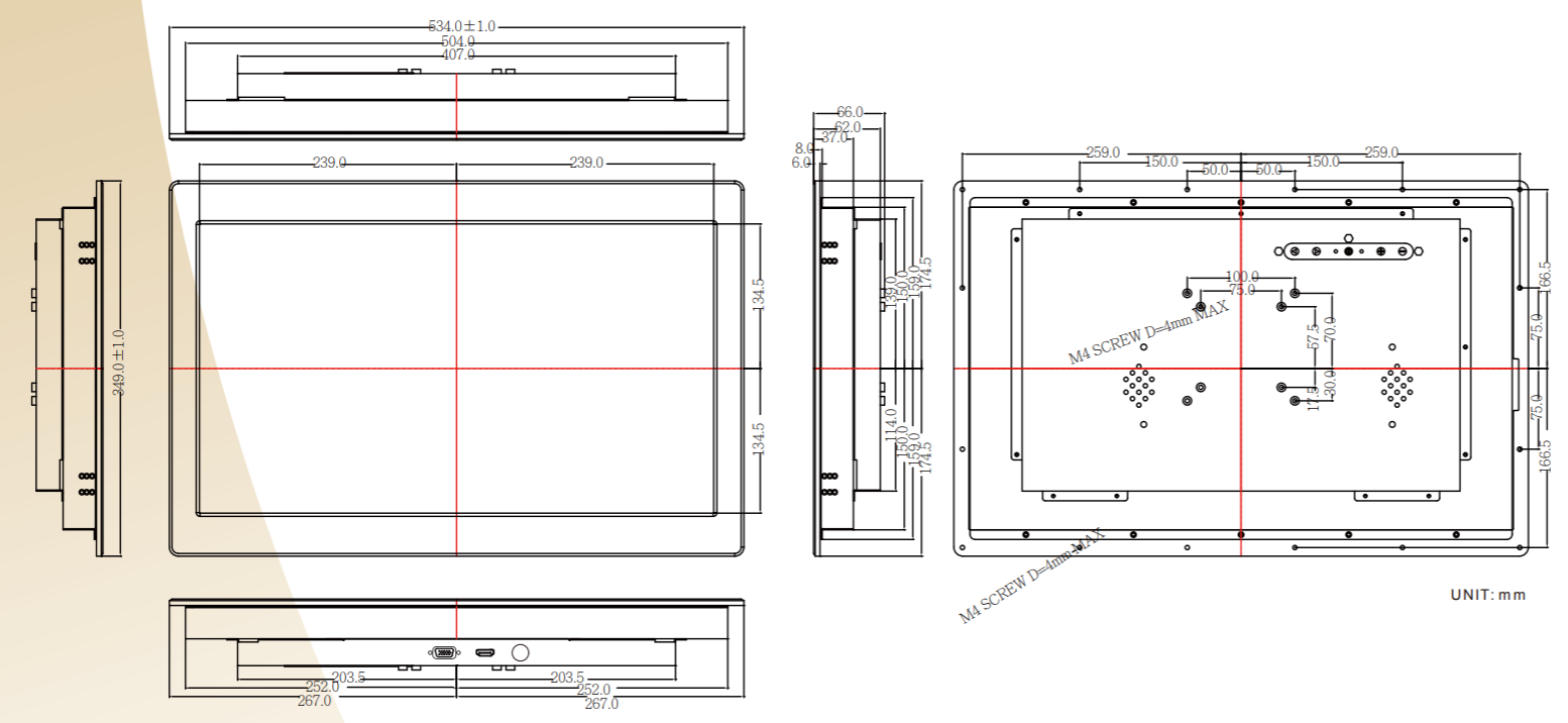 - Сенсорный экран: опционально доступен резистивный сенсорный экран или SAW (поверхностно-акустическая волна).