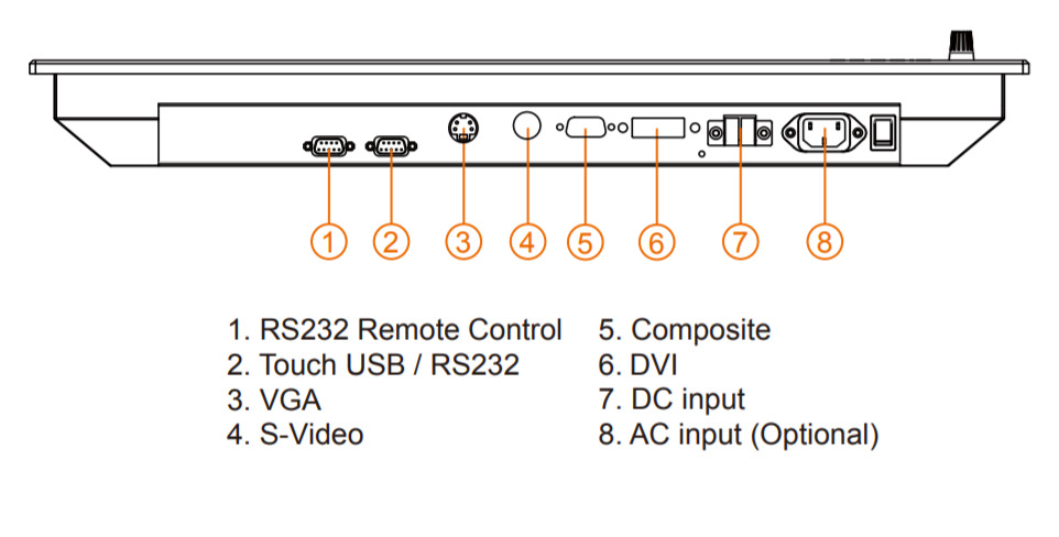 Преимущества модели включают высокую яркость и контрастность, обеспечивающие четкость изображения при различных уровнях освещенности. Резистивный сенсорный экран гарантирует точное управление в условиях повышенной влажности и вибраций. Класс защиты IP65 по передней панели и IP54 по тыльной стороне обеспечивает защиту от пыли и влаги, соответствуя международным стандартам. Гибкость подключения различных устройств обеспечивается наличием интерфейсов VGA, DVI-D и Video, а также опциональным RS-232. Широкий диапазон входного напряжения питания от 9 до 36 В DC позволяет интегрировать монитор в различные системы без дополнительных преобразователей.