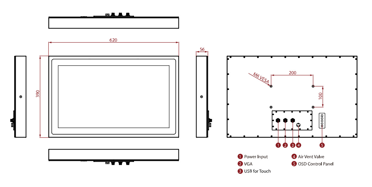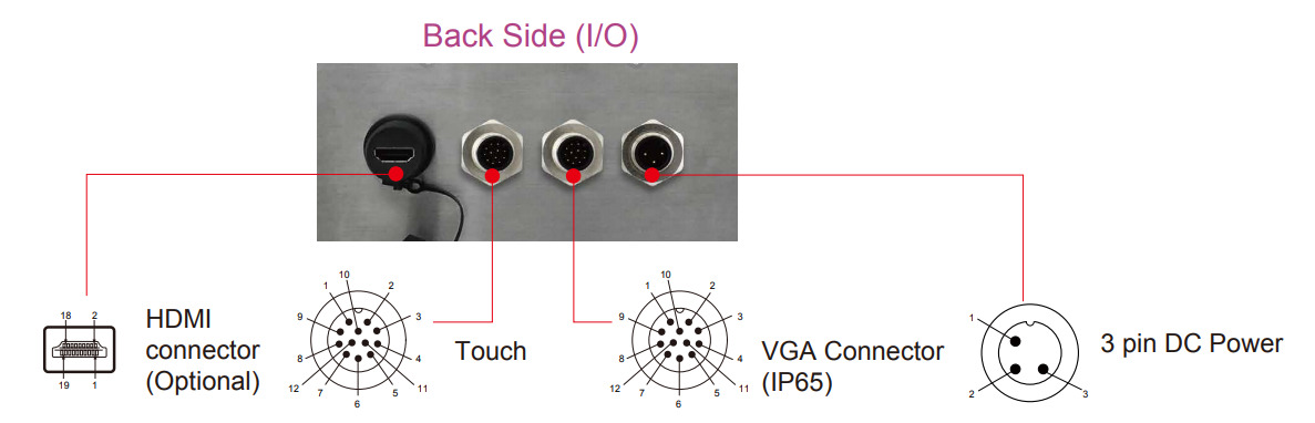 - Интерфейсы: 1 x VGA (M12), 1 x HDMI (опция), 1 x DVI (опция), 1 x USB (M12)