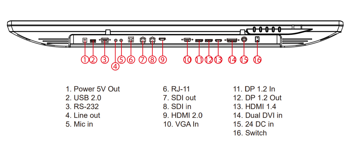 - Интерфейсы: VGA, DVI, HDMI, DisplayPort, 3G-SDI, USB 2.0, RS-232, RJ-11, аудиоразъемы для микрофона и наушников.